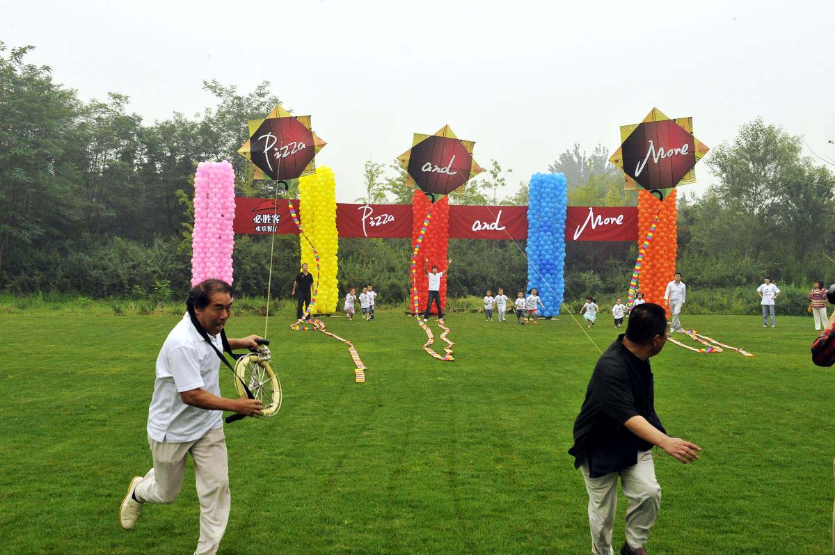 1只8平米的大風(fēng)箏需要3個(gè)成年人才能放飛到天空。7月11日,在9位風(fēng)箏高手的配合下,3只巨型風(fēng)箏帶著必勝客的新口號(hào)“Pizza and