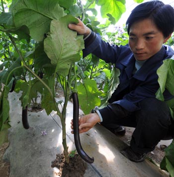 中國(guó)西部航天育種基地培育的航天蔬菜。技術(shù)人員丁耀宏展示正在進(jìn)行選育的一種航天茄子。新華社記者 韓傳號(hào)