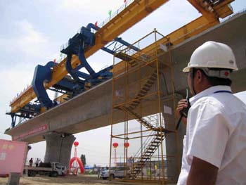 6月18日,陜西興平西寶客運專線架梁施工現(xiàn)場,西保客運專線全線開始架梁。新華社記者李一博/攝 |