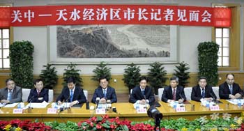 | 2010年4月9日,關中—天水經(jīng)濟區(qū)“七市一區(qū)”市長在西安與中外媒體記者見面,通報《關中—天水經(jīng)濟區(qū)發(fā)展規(guī)劃》實施情況。資料照片 |