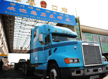 俄羅斯貨車從琿春口岸進入中國。新華社記者徐家軍/攝 |