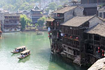 圖為游客在湘西鳳凰沱江上泛舟欣賞沿岸的特色民居。新華社記者 龍弘濤/攝 | 免費西湖帶動杭州“大旅游”產(chǎn)業(yè)增值