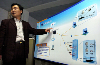 在建設(shè)部授予“全國數(shù)字社區(qū)示范工程”稱號(hào)的江蘇鎮(zhèn)江恒美嘉園光纖到戶項(xiàng)目現(xiàn)場,工作人員在介紹光纖到戶、三網(wǎng)融合示意圖。2005年,該光纖駐地網(wǎng)就全面開通,覆蓋用戶1000多家。資料照片 |