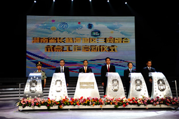 長株潭城市群三網(wǎng)融合試點(diǎn)工作方案16日在長沙正式拉開大幕。7月1日,國務(wù)院公布第一批12個(gè)電信網(wǎng)、廣播電視網(wǎng)和互聯(lián)網(wǎng)三網(wǎng)融合國家試點(diǎn)地區(qū)(城市),長株潭地區(qū)是試點(diǎn)中的唯一城市群。圖為啟動(dòng)儀式現(xiàn)場,湖南省委書記周強(qiáng)按下啟動(dòng)按鈕。新華社記者 李丹/攝 |