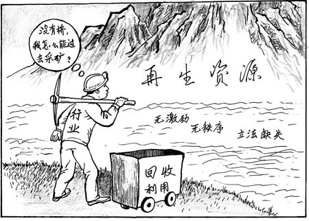 再生資源的利用是一座巨大的金礦,許多國家再生資源的產值已經超過了其支柱產業(yè),而我國每年可以回收利用但又沒有被回收利用的再生資源價值達350—400億美元。面對這樣的一個金礦,有人問:“為什么不去挖呢?”。發(fā)展再生產業(yè)既能創(chuàng)造價值又能減輕環(huán)境污染、節(jié)約能源,何樂而不為呢?問題在于,再生資源產業(yè)發(fā)展的法規(guī)不健全,現有的激勵政策缺乏系統性和可操作性,導致產業(yè)無序化發(fā)展。比如,沒有正確的垃圾分類,再生資源無法回收,再生資源產業(yè)也就成了“無米之炊”。因此,要使這個金礦被挖掘,就需要國家加強這方面的立法,下大力氣在資金、技術、管理等方面扶持再生資源產業(yè)。改變再生產業(yè)經營規(guī)模小、技術落后等現狀。像這樣利于后代、利于可持續(xù)發(fā)展的事業(yè),不做好,太可惜! |