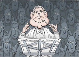 《今日美國報》和蓋洛普公司本周公布的一項最新民意調(diào)查顯示,美國總統(tǒng)布什的支持率跌至近幾十年來歷任美國總統(tǒng)的新低,僅僅有29%。布什的國內(nèi)外各項政策都沒有得到好的反響。 在漫畫中,作為樂隊指揮,布什“不辭辛勞”地獻上一首首曲子,既有國內(nèi)雅調(diào),又有國外名曲;既有能源、環(huán)境大餐,又有教育等小菜。然而,不管這位指揮家如何自鳴得意,臺下的聽眾無一不是緊捂耳朵,不愿再聽。
