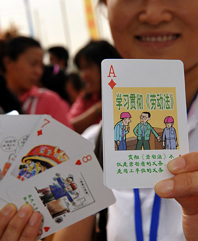 7月28日,一名職工展示普法撲克牌。當日,寧夏召開“法律進寧東能源化工基地”現(xiàn)場會,在會上向企業(yè)員工發(fā)放《法律知識讀本》、維權(quán)聯(lián)系卡和普法撲克牌,宣傳依法維權(quán)知識。