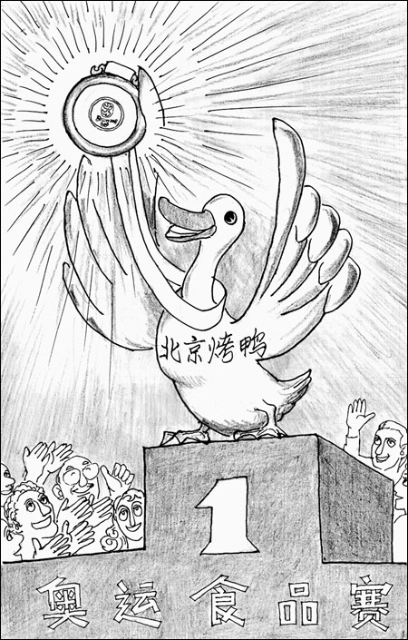 奧運期間,對大量擁入北京的外國運動員及其他游客來說,一定不可錯過的美食無疑是北京烤鴨。奧運村美食受稱贊,最明顯也是烤鴨供不應(yīng)求,供應(yīng)量已從每天300只增加到600多只。澳大利亞的報紙甚至幽默地說,“是北京烤鴨幫助澳大利亞選手特里克特贏得100米蝶泳金牌!眹饷襟w評價北京烤鴨奪得了人氣金牌。中華文化博大精深,飲食文化只是其中之一,只要我們認真努力發(fā)揚光大,得金牌何止北京烤鴨呢。