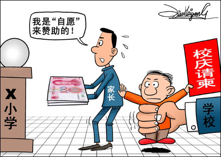 某小學(xué)借校慶之名給家長(zhǎng)發(fā)請(qǐng)柬,老師通過學(xué)生“轉(zhuǎn)話”:慶典之日到!百澲币幌,有的老師干脆給“份子錢”訂了200元的標(biāo)準(zhǔn)。校方解釋,家長(zhǎng)贊不贊助完全出于自愿,學(xué)校并沒強(qiáng)迫。然而孩子在學(xué)校,家長(zhǎng)豈有不“自愿”之理!