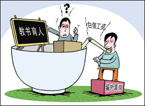河南省郟縣有252個“編外離崗”教師,有的還不到40歲,但待遇卻與在職教師相同,坐在家里什么都不用干,工資照拿不說,而且還能晉檔晉級,被戲稱為“白領(lǐng)”——白白領(lǐng)工資(9月14日 《中國青年報》)。 編外離崗算帶薪,捷足先登當(dāng)白領(lǐng)。 坐家晉升不費事,笑納工資與獎金。 世間最重是公平,教育腐敗傷人心。 撕破臉皮查個透,到底是誰得了。