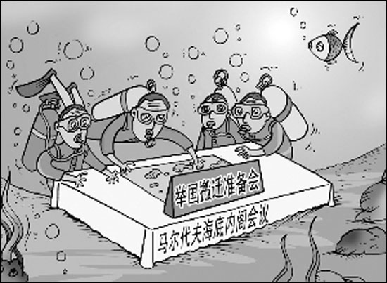 馬爾代夫總統(tǒng)將在水下6米處海底主持一次內(nèi)閣會議,討論通過決議呼吁重視溫室效應(yīng)。在氣候變化面前,馬爾代夫已經(jīng)成為人類命運的一面鏡子。這個彈丸小國正為最壞的情況做準(zhǔn)備,那就是舉國搬遷。