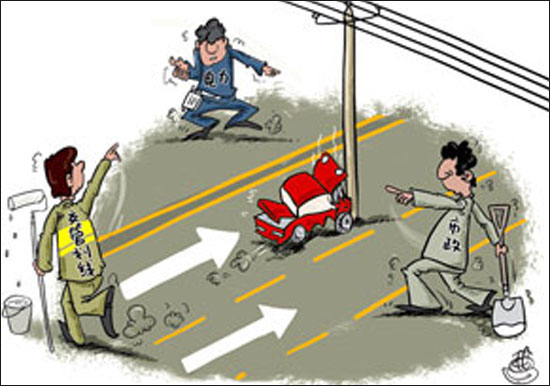 新聞背景:鄭州網(wǎng)友近日發(fā)帖稱,鄭州市區(qū)連云路上一處交通直行箭頭指向馬路中央的一根電線桿,網(wǎng)友戲稱“”。記者調(diào)查發(fā)現(xiàn),鄭州多條道路上都存在電線桿占道情況。對(duì)此,電力部門稱,電線桿占道是修路所致,希望相關(guān)部門修路前做好協(xié)調(diào)。(11月10日《河南商報(bào)》)