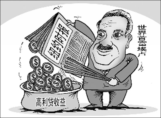 去年初,陷入財(cái)務(wù)窘境的紐約時(shí)報(bào),低聲下氣地找到墨西哥電信大亨埃盧,獲得了一筆年利率14.1%的2.5億美元貸款,并向埃盧提供1590萬份紐約時(shí)報(bào)認(rèn)股權(quán)證。這筆交易讓這位《福布斯》新科世界首富一年就掙回了約1.2億美元。