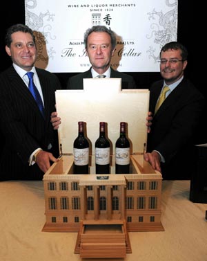 5月26日,嘉賓和即將在香港拍賣的3瓶瑪歌堡頂級佳釀連精美Linley酒柜合影(起拍價為港幣40萬元)。當(dāng)日,Acker Merrall &