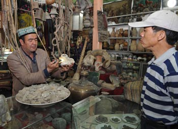“你知道我的夢想是什么嗎,我想收集齊中國56個民族每個民族的特色藏品,讓我的民間博物館成為最豐富的民族收藏品展館!薄 ≌f這話的,是新疆喀什的一位維吾爾族民間收藏家艾尼·阿布拉。他的博物館位于當(dāng)?shù)刈钪睦铣歉吲_民居上,琳瑯滿目的各樣藏品讓進入其中的游客目不暇接。 一個春日的午后,記者信步走進迷宮般的喀什老城,七彎八繞中,一條小巷的一角,“高臺民居文物博物館”吸引了記者的目光。順著敞開的大門望進去,地下隨意堆放著大大小小的石頭,墻壁上掛著大幅手繡的毛澤東、列寧等人物的掛像。 穿過小小的院子,走進10多平方米的博物館,民間收藏家艾尼·阿布拉就和他的收藏品一起出現(xiàn)在眼前:土陶、紡車、銅器、刺繡、紡織品、留聲機、古錢幣、瓷盤、經(jīng)書、化石……讓人一走進去,就像走進了歷史。 “我從小就熱愛收藏,10多歲起就喜歡到處去收些古物件,現(xiàn)在我有5萬多件藏品,大多數(shù)是與新疆各地各民族的生活有關(guān)的! 艾尼·阿布拉向記者展示了他的鎮(zhèn)館之寶——一枚羊頭化石。這枚化石長10多公分,顏色發(fā)白,分量不輕,完整的山羊頭型和兩排牙齒清晰可見,用小手電照進去,整塊化石清亮通透,十分稀罕。像這樣稀奇的物件,艾尼的民間博物館中還有很多,隨手拿起一件,都能聽到一個古老的故事。 喀什是中國最西部的城市,作為古絲綢之路上的商埠重鎮(zhèn),喀什還是我國首批旅游文化名城之一。深厚的歷史文化積淀和多元化的民俗風(fēng)情使喀什市成為新疆最受游客喜愛的旅游目的地之一。 從小就游走在新疆各地喜愛收藏的艾尼·阿布拉,熱衷于收藏有關(guān)民族的古物:古色古香的少數(shù)民族燭臺、不同朝代不同民族的服裝服飾、孫中山和宋慶齡合影的細瓷盤、杭州都錦廠造的孫中山、毛澤東等人的織錦畫像、用金粉書寫的古蘭經(jīng)、年代久遠的鐵制佛頭、官印……每個物件背后,都有著一串串的故事。 2002年,看到越來越多的游客涌入喀什老城中的高臺民居,艾尼·阿布拉終于為他幾十年來的淘寶生涯找到了出口:開辦個人博物館,展示新疆傳承久遠的歷史文物,讓游客通過他的博物館了解新疆各地的歷史文化。“我的客人很多,有美國的、德國的、日本的、土耳其的,還有很多來自內(nèi)地的游客,他們喜歡通過這些古老的東西了解新疆,也愿意聽我講故事! 為了實現(xiàn)自己收藏各民族文物的理想,艾尼·阿布拉常常獨自一個人跑到周邊的州縣少數(shù)民族聚居區(qū)去收購老物件,柯爾克孜族、塔吉克族、塔塔爾族……許多人口較少民族手工制作的精美用具都被艾尼收了回來,而這些充滿記憶的收藏品展示在喀什老城古老、神秘、幽深的民居中,讓人仿佛回到了幾百年前的古街深巷。