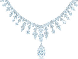 自1837年成立以來,蒂芙尼就以出品世界上最精美的鉆石著稱。這些無與倫比的精美鉆石在顏色、凈度和切割工藝上都遵照最高標(biāo)準(zhǔn),鑲嵌在精致底座上散發(fā)流光溢彩,演繹著現(xiàn)代奢華。這件驚艷之作傳承了蒂芙尼一貫追求的卓越品質(zhì)傳統(tǒng)。鉑金鑲嵌手工切割的圓形和梨形鉆石圍繞著一枚30.31克拉、凈度為IF(內(nèi)部無雜質(zhì))級的鉆石吊墜。項鏈與女性優(yōu)雅的頸項曲線完美契合,星光熠熠,彰顯奢華氣質(zhì)。