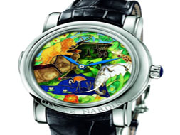 雅典(Ulysse Nardin)熱帶森林三問報時鉑金腕表這款獨具風(fēng)格的腕表系列擁有直徑42毫米鉑金表殼,其所有魅力薈萃于具有三維立體效果的彩色琺瑯表盤:按下三問報時滑塊,報時聲響,一幅生動的熱帶森林景象立即顯現(xiàn)——猴子等動物在樹枝上飛奔跳躍,以躲避獅子的襲擊。表殼:鉑金材質(zhì),圓形表殼,鉑金底蓋。表盤:掐絲琺瑯,不設(shè)時間刻度,葉形指針,。機(jī)芯:手動上弦機(jī)械機(jī)芯,48小時動力儲備。功能:時、分、三問報時。