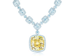 蒂芙尼蜚聲國際,彩鉆功不可沒。Blue Book華貴珠寶系列中,這款由一顆20.34克拉艷彩黃鉆吊墜、37顆蒂芙尼Legacy鉆石和674顆圓鉆組成的項(xiàng)鏈別具風(fēng)格,黃鉆吊墜具有極高的飽和度、色散光度和亮度,是蒂芙尼能工巧匠的又一傾心之作。