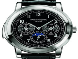 5074P鉑金腕表42毫米鉑金表殼氣魄非凡,其左端滑塊可啟動兩響教堂琴音報時裝置。這款自動上弦腕表的另一復(fù)雜功能是指針可顯示星期、日期、月份及閏年,并配備月相顯示的萬年歷。表殼:鉑金材質(zhì),圓形表殼,藍(lán)寶石水晶底蓋可顯示機(jī)芯運轉(zhuǎn),亦可更換為鉑金底蓋。表盤:烏木黑色漆面,葉形指針,阿拉伯?dāng)?shù)字時標(biāo),軌道式分鐘刻度。機(jī)芯:Calibre
