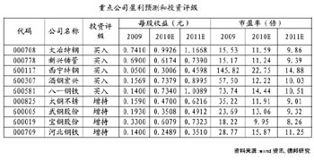 鋼鐵業(yè)還有其他兩類題材也可以關(guān)注,就是特鋼公司和受益區(qū)域經(jīng)濟(jì)發(fā)展的公司。 愛建證券發(fā)布的報(bào)告表示,下半年具體投資策略可遵循以下思路:一類是特鋼行業(yè),如大冶特鋼、中原特鋼等,另一類是受益于區(qū)域經(jīng)濟(jì)大發(fā)展的公司如八一鋼鐵。 報(bào)告稱,特鋼行業(yè)盈利較普鋼行業(yè)更穩(wěn)定。由于特鋼行業(yè)從生產(chǎn)工藝到產(chǎn)品用途與普通碳鋼都有著很大差別,因此普通碳鋼所面臨的諸如產(chǎn)能過剩、原材料價(jià)格上漲對特鋼而言,都不會(huì)構(gòu)成太大的問題。而且特鋼產(chǎn)品具有良好市場前景,從過去幾年的情況看,特鋼產(chǎn)品即便有成本上漲壓力也能夠通過向下游提價(jià)轉(zhuǎn)移釋放,使毛利率繼續(xù)保持穩(wěn)定。因此可以看到,在最近一年的走勢中,特鋼股票明顯要強(qiáng)于普鋼股票。下半年仍可關(guān)注特鋼類上市公司,如大冶特鋼、中原特鋼等。 區(qū)域經(jīng)濟(jì)發(fā)展也將帶來一定機(jī)會(huì)。該券商報(bào)告表示,中期來看,到2015年新疆人均地區(qū)生產(chǎn)總值達(dá)到全國平均水平,城鄉(xiāng)居民收入和人均基本公共服務(wù)能力達(dá)到西部地區(qū)平均水平,基礎(chǔ)設(shè)施條件明顯改善,“十二五”期間新疆全社會(huì)固定資產(chǎn)投資規(guī)模將比“十一五”期間翻一番多;長期來看,到2020年,確保實(shí)現(xiàn)全面建設(shè)小康社會(huì)的奮斗目標(biāo),基本消除絕對貧困現(xiàn)象。預(yù)計(jì)中央會(huì)繼續(xù)加大對新疆地區(qū)的基礎(chǔ)設(shè)施投入,包括電網(wǎng)、鐵路、公路的建設(shè)和部分地區(qū)的住房改造。因此,未來幾年新疆地區(qū)的鋼材需求增速將大大高于國內(nèi)平均水平,這將讓疆內(nèi)唯一的鋼鐵公司——八一鋼鐵受益不少。 東方證券也表示,從結(jié)構(gòu)看,具備產(chǎn)品優(yōu)勢和區(qū)域優(yōu)勢的鋼鐵公司,目前調(diào)整后的股價(jià)已經(jīng)具有吸引力。重點(diǎn)推薦:大冶特鋼、八一鋼鐵、寶鋼股份。