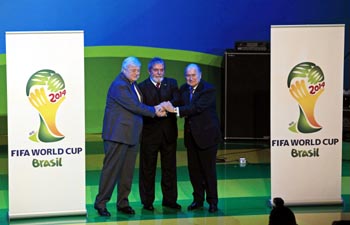 7月8日,巴西總統(tǒng)盧拉(中)、巴西足協(xié)主席特謝拉(左)和國(guó)際足聯(lián)主席布拉特在“通往巴西2014之路”活動(dòng)啟動(dòng)儀式上握手。當(dāng)日,在南非約翰內(nèi)斯堡舉行的“通往巴西2014之路”啟動(dòng)儀式公布了2014年巴西世界杯會(huì)徽。新華社/路透 |