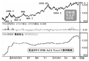 Trust黃金持倉(cāng)變動(dòng)曲線,中間的柱狀指標(biāo)代表其每次交易的增減倉(cāng)行為。從圖中可以看出,在2009年金價(jià)見(jiàn)頂1226.65美元后大幅調(diào)整至1044.2美元的過(guò)程中,SPDR