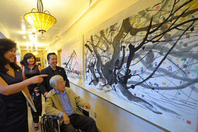7月11日,《吳冠中大師紀(jì)念展》在美國加州奧克蘭市的美國中國藝術(shù)博物館舉行。圖為吳冠中弟子、畫家葉森(右一坐輪椅者)等欣賞吳冠中畫作《小鳥天堂》。 這一展覽共展出美國舊金山灣區(qū)華人收藏家收藏的7幅吳冠中作品。一些著名畫家和當(dāng)?shù)厝A人藝術(shù)家當(dāng)天出席紀(jì)念展,共同緬懷吳冠中大師不平凡的藝術(shù)人生。劉藝霖攝