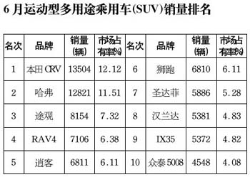 6月運(yùn)動(dòng)型多用乘用車銷量排名