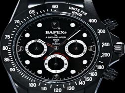 黑色對于很多人來說充滿了深藏不露的神秘感,特別是全黑魂版的手表,一向是潮人的入貨指標(biāo),就連藤原浩都找英國的Bamford Watch Department用PVD技術(shù)去特制了些fragmentdesign閃電版“黑撈”。而BAPE亦乘勢推出了最新的全黑魂版的Bapex,3針表上除了數(shù)字、刻紋外,無論表身、表帶、表盤全用上黑色作主要色調(diào),cool!