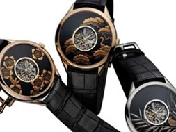 d'Art藝術(shù)大師系列表款,完美體現(xiàn)出日內(nèi)瓦傳統(tǒng)的鐘表裝飾藝術(shù),精湛的刻工,華美的色彩以及細(xì)膩的寶石鑲嵌。但今年,江詩丹頓的目光轉(zhuǎn)向東方,與Z?hik,日本最古老的漆公司之一,合作生產(chǎn)漆器表盤。