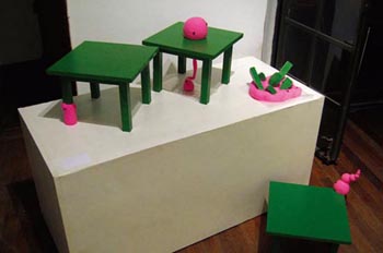space”,途中一共問了6個交通協(xié)管員。這是一幢帶花園的小洋樓,仔細尋找一番后,終于在門口看到了關于這個展覽的小小招貼—巴掌大的招貼用纖細的文字告訴你:就在這里。這讓我想起星爺版《鹿鼎記》中韋小寶在菜市場尋找天地會分舵的一幕。展廳大概10平方米,里面擠滿了“藝術發(fā)燒友”。當時我就在想,做這樣的展覽真好,只要來五六個人,就感覺濟濟一堂了。 楊腸筱道,這個名字來自這次展覽的兩位女藝術家,胡筱瀟和陸楊?吹剿齻儠r,胡筱瀟正在給每位來賓分發(fā)她的藝術材料,一種顏色奇艷、介于雕塑泥和軟糖之間的泡沫,她就是用這種古怪材料加上幾只仿真蒼蠅、幼兒園的木質(zhì)小板凳,糾纏在一起做出的作品。當看到每一位來賓一邊談話,一邊手里都不知不覺把她的泡沫泥捏成稀奇古怪的形狀時,我知道,胡筱瀟又在得意了。我們都已經(jīng)不自覺地成了她作品的一部分。然后她還用非常劣質(zhì)的木框把自己寫的類似童話、詩歌或者小說的文字框起來,一絲不茍地譯成英文。真有不少人在認真地試圖讀懂其中的意思。這就是小空間的好處,空間太小人太多,當你不認識什么人也無話可說的時候,最好就是假裝去思考作品的深刻含義。 陸楊的作品和她的長相一樣,貌似清秀,但這是假象。她喜歡很和藹可親地給你講述一件無比殘酷的事情。她的作品用很清秀的手繪圖片和很干凈細膩的文字,告訴你很多種新奇的自殺方式。對殘酷的迷戀,或許是80后新人的某種集體愛好吧。