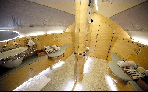 淋浴間設(shè)有兩間專供頭等艙客人使用的浴室,各種洗漱用品甚至連穿衣鏡和衣架等都一應(yīng)俱全