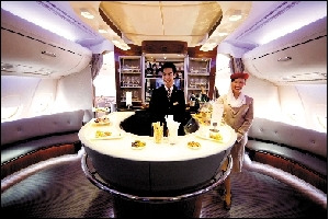 登上A380參觀的媒體紛紛涌入頭等艙配備的兩個(gè)空中浴室一睹為快。浴室面積雖然不大,但空間劃分井然有序,設(shè)有玻璃門的淋浴間、梳洗臺,洗漱用品甚至連穿衣鏡和衣架等都一應(yīng)俱全。乘務(wù)員提醒,要在飛機(jī)上享受淋浴服務(wù),需要登機(jī)后與乘務(wù)員預(yù)約。 位于二層樓梯口處的酒吧區(qū),供頭等艙和商務(wù)艙乘客使用。記者看到,兩邊圓弧形的座椅可以容納大約10人就座,再加可供站立的空間,整個(gè)區(qū)域可容納約20人。 相比之下,一層的經(jīng)濟(jì)艙區(qū)域顯得較為普通,與其他航班無異。