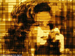據(jù)《每日郵報(bào)》報(bào)道,一位烏克蘭藝術(shù)家發(fā)明了一種全新的藝術(shù)創(chuàng)作形式,他用封箱膠帶作畫,在燈箱上“粘”出經(jīng)典的電影鏡頭。 今年51歲的馬克·凱斯曼出生在烏克蘭,目前在美國(guó)費(fèi)城工作和生活。他巧妙地利用了燈箱作為光源背景,用棕色透明膠帶在上面粘出一幅幅繪畫作品。凱斯曼把他最喜愛的電影鏡頭當(dāng)作作畫的素材,通過膠帶的重疊層次變化表現(xiàn)色彩明暗和深淺。 令人驚奇的是,這些膠帶畫雖然材料粗糙,卻異常精美,連人物的面孔和表情都惟妙惟肖。