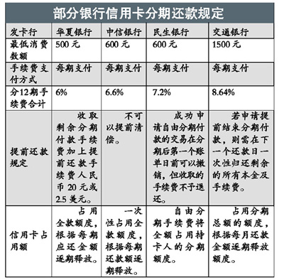 記者了解到,信用卡主要在分期付款消費(fèi)起點(diǎn)與分期還款手續(xù)費(fèi)率上進(jìn)行優(yōu)惠。