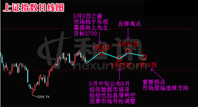 點(diǎn)。中國(guó)經(jīng)濟(jì)長(zhǎng)期向好毋庸置疑,在此溫和通脹的宏觀背景下,股市中期仍然將會(huì)保持振蕩上漲格局,就9月份而言,銀行、地產(chǎn)、有色、鋼鐵、石化、航空航運(yùn)、煤炭采掘等行業(yè)總體處于較低估值水平,向下空間的相對(duì)有限,也封殺了大盤(pán)下跌空間。 因此總體上,9月將呈震蕩向上格局,月初9月9日拐點(diǎn)之前偏于樂(lè)觀,2700點(diǎn)仍可見(jiàn)到。而后,因?yàn)?月中旬8月宏觀經(jīng)濟(jì)數(shù)據(jù)出爐,通脹等因數(shù)將令市場(chǎng)重新?lián)鷳n央行加息提準(zhǔn)等利空因素,如果這種擔(dān)憂引發(fā)調(diào)整,那么調(diào)整或?qū)⒊掷m(xù)至9月20日時(shí)間窗口。隨后市場(chǎng)反彈至23日見(jiàn)高點(diǎn)后,調(diào)整至30日。因?yàn)槭婚L(zhǎng)假即將來(lái)臨,周邊市場(chǎng)不確定加大,月底30日將是一個(gè)成交低迷期,市場(chǎng)面臨重新的方向性選擇。