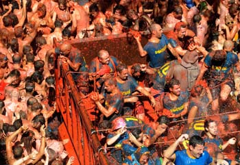 西班牙小鎮(zhèn)布尼奧爾8月25日迎來一年一度最重要的節(jié)日——西紅柿節(jié)。來自世界各地4萬多名游客歡聚在這里,相互投擲100多噸西紅柿,快樂上演了一場“西紅柿大戰(zhàn)”。 布尼奧爾位于西班牙東部巴倫西亞市以西40公里,人口約1萬。每到舉行“西紅柿節(jié)”時(shí),這個(gè)平日里很安靜的小鎮(zhèn)就變得人聲鼎沸。游客不為美景、美食,只為“打仗”。 “西紅柿大戰(zhàn)”不僅為布尼奧爾帶來名氣,也帶來商機(jī)。節(jié)日期間,小鎮(zhèn)賓館爆滿,餐館、酒吧人滿為患,超市、商店顧客川流不息。街邊隨處可見賣泳鏡、一次性相機(jī)、紀(jì)念版T恤等物品的小攤位,因西紅柿汁會灼痛眼睛,損壞相機(jī),更會將衣褲染色。為這短短一上午激烈“戰(zhàn)斗”,不光人要“裝備”,就連建筑物也需要。街坊鄰居早早用木板、塑料布將門窗等遮得嚴(yán)嚴(yán)實(shí)實(shí),否則后果“不堪設(shè)想”。 “戰(zhàn)爭”還引來各國媒體爭相報(bào)道。當(dāng)局向從鎮(zhèn)政府陽臺及運(yùn)送“武器”卡車上拍攝的攝影和攝像記者收取500歐元到2500歐元的“最佳位置拍攝費(fèi)”。 很多游客迫不及待趕到鎮(zhèn)政府廣場。小伙子赤膊上陣,姑娘們身著比基尼。居住在臨街的人不時(shí)從陽臺潑出幾盆涼水,為將投入“戰(zhàn)斗”的人熱身。上午11時(shí),爆竹騰空而起,“戰(zhàn)斗”號角吹響,廣場上一片沸騰,人們有節(jié)奏高喊“布尼奧爾”和“西紅柿”。 近10輛滿載西紅柿的卡車向小鎮(zhèn)中心廣場進(jìn)發(fā),一路上向參加戰(zhàn)斗的人運(yùn)送“彈藥”。大量被碾碎的西紅柿從卡車尾部傾瀉而出,每輛卡車上20多名工作人員從車廂內(nèi)抓起“彈藥”,奮力向人群拋,車下手持西紅柿者紛紛回?fù)。守候在樓頂上的人則拿起水龍頭,居高臨下攻擊街上本已亂作一團(tuán)的人群。 大家手抓“西紅柿”,見人就打,不分?jǐn)澄遥B運(yùn)送“武器”的卡車司機(jī)也無辜遭殃。無數(shù)西紅柿在頭頂飛舞、落下。為躲避來自四面八方的襲擊,大家左躲右閃,“中彈”只是遲早的事情。稍不留意,便有人從地上捧起一把西紅柿漿向旁邊人淋頭澆下。 戰(zhàn)斗結(jié)束時(shí),地面上積攢了厚厚一層西紅柿汁,意猶未盡的戰(zhàn)士們開始撲倒在地。有人擺出仰泳姿勢,周圍的人立刻往他身上堆積西紅柿汁,直到僅剩一張臉露在外面。 最后,人們走上街頭與環(huán)衛(wèi)工人一起用掃把、高壓水槍清掃街道、墻面,水槍還會不時(shí)對準(zhǔn)人群“掃射”,大家再次興奮起來。很快在腳下匯成一條條“西紅柿小溪”,湍急的“溪流”朝小鎮(zhèn)四周低處流去。 小鎮(zhèn)很快恢復(fù)了往日的潔凈,看不見西紅柿痕跡,如同剛下過一場雨。此時(shí),街邊塑料紙和木板也被陸續(xù)撤走,露出小鎮(zhèn)原來的面容。 “西紅柿節(jié)”起源于1945年8月最后一個(gè)周三。當(dāng)時(shí),小鎮(zhèn)舉行游行活動,一名年輕人在人群中被推倒,起身后順手拿起路邊菜攤上的西紅柿,砸向周圍的人,結(jié)果大家打成一團(tuán)。次年,一群年輕人帶著西紅柿到廣場,又打了一場“西紅柿大戰(zhàn)”。此后,“西紅柿大戰(zhàn)”逐漸成為小鎮(zhèn)居民一場約定俗成的活動。 小鎮(zhèn)當(dāng)局一度禁止人們互相投擲西紅柿,但當(dāng)?shù)厝伺e行大規(guī)模游行示威,當(dāng)局終于在1957年同意將每年8月最后一個(gè)周三確定為“西紅柿節(jié)”,并由當(dāng)局提供西紅柿。2002年,西班牙政府將“西紅柿節(jié)”列入具有國際旅游價(jià)值的節(jié)日。
