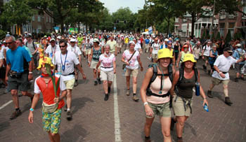 7月20日凌晨3點,荷蘭西部小城奈梅亨。盡管正值夜最深沉之時,卻有一大幫人成群結隊地開始穿城而行。這些人既有英姿颯爽的各國軍人,也有頭發(fā)花白的耄耋老者,還有青春活潑的少年學生,而更多的,則是普普通通的民眾。 上述這一幕如果讓不明其由的人看起來,似乎頗有些怪異,但實際上,它卻是一場多達4萬人參加的節(jié)日的序幕——奈梅亨4日徒步節(jié)。 世界上的節(jié)日千奇百怪,但是以走路為主題而進行狂歡的節(jié)日卻甚為少見。1909年,奈梅亨當?shù)氐囊恍┤碎_始組織一項徒步活動,最初僅僅是針對軍人而設立的。但是隨著近百年來的發(fā)展,這項全球最古老的徒步活動如今已經(jīng)吸引了越來越多的普通民眾參與,成為全球規(guī)模最大的多日徒步活動。而且,雖然活動以徒步行走為主題,但是在徒步行走開始之前,整個奈梅亨小城都會陷入一連幾天的狂歡,大型歌舞、盛裝巡游等等,讓盛夏的艷陽為人們宣泄激情提供最好的陪襯。 據(jù)活動主辦方介紹,今年的徒步節(jié)盛況空前,由于報名者太多,組委會不得不抽簽“淘汰”了約3000人。來自23個國家和地區(qū)的軍人以及60多個國家和地區(qū)的各界民眾,分為30公里、40公里和50公里3個組別,從20日凌晨開始了連續(xù)4天的徒步行進。換言之,參加徒步節(jié)的選手,最高需要在4天時間內(nèi)連續(xù)行走200公里。 由于往屆活動中出現(xiàn)過高溫天氣導致民眾發(fā)生意外的情況,因此組委會今年特別安排選手們凌晨3點出發(fā),以避開高溫。選手們從奈梅亨市區(qū)出城,沿鄰近城鎮(zhèn)繞行,并最終回到市區(qū)。 時值盛夏,盡管選手們從凌晨就開始陸續(xù)出發(fā),但是在行走了約摸三四個小時之后,正值疲勞襲來之時,太陽卻又躍上頭頂,無疑成為對人們意志的最大考驗。許多選手都在脖子上搭條汗巾,而許多住在沿途的民眾也自發(fā)為選手們送上飲料。炙熱的驕陽,枯燥的行走,但是整個隊伍中卻不乏歡聲笑語,整個活動充滿了歡快的氣氛。 一位荷蘭老先生對記者說:“我參加這個活動已有10多年了,以往都是參加50公里的,只是今年歲數(shù)大了,才改成40公里!绷硪幻商m中學生告訴記者:“我是聽朋友介紹才知道這個活動的,當時就覺得很有意思,很想?yún)⒓印=衲晡沂堑谝淮螀⒓舆@個活動,我也不知道能不能堅持走完4天,但是我想挑戰(zhàn)一下自己。” 直至午間時分,開始陸續(xù)有人抵達終點。依然保持整齊隊形前進的,無疑是各國的軍人;而更多的人則在抵達終點的瞬間擺出各種各樣慶祝的POSE——或者作出勝利的姿勢,或者將汗巾拋灑向天空,或者與伙伴擊掌相慶…… “走路確實是件很平常,很單調(diào),甚至會讓你覺得有些無聊的事情,但是能夠和幾萬人一起行走,一起挑戰(zhàn)自己,我覺得這會給我?guī)砟蟮目鞓贰,一位選手在抵達終點后說,“在這樣炎熱的天氣里,自己的汗水浸濕了衣服,而我也得到了最好的鍛煉,不僅僅是身體上,更關鍵是我自己的意志!