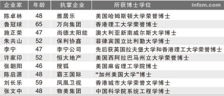 “榮譽博士”),占比42%。 42人當中,頭頂博士帽的有近10人。不過,這10人當中,除朱共山等花錢抄近道修得的海外博士,以及如魯冠球等后來獲得的榮譽博士之外,按部就班、不打折扣的博士學位獲得者鳳毛麟角,尚德太陽能的掌門人施正榮便是其中之一。 施正榮兩年前曾被通用電氣高管羅琳·波爾森稱為是“10年后超過比爾·蓋茨的全球巨富熱門人物”,從長春理工大學本科畢業(yè),到赴中科院上海光學精密機械研究所念碩士,再到澳大利亞新南威爾士大學獲得博士學位之后,他才開始參加工作,在澳大利亞奮戰(zhàn)了8年,然后于2000年回國創(chuàng)業(yè),成立無錫尚德。從嚴格意義上來說,他是學者創(chuàng)業(yè)型的富豪和企業(yè)家,對習慣了“野蠻生長”的中國企業(yè)家們來說,這種路徑顯然是不可復制的。 不同于張朝陽和施正榮這種海歸博士,張文中等民營企業(yè)家則是在國內(nèi)高校拿到的博士學位。張文中是物美控股集團前董事長,1962年生于山東,本科和研究生都是在南開大學讀的,25歲取得碩士學位后被分配到國務(wù)院發(fā)展研究中心,五年后,他在擔任世界銀行和國家“863”科技基金支持的一研究課題組長中表現(xiàn)突出,受到部委領(lǐng)導好評,不久后他于中國科學院獲得系統(tǒng)工程學博士學位;1994年他在北京創(chuàng)建物美商城。 張文中2006年身陷囹圄,兩年后一審被判有期徒刑18年。引人關(guān)注的是,接替張文中任物美董事長的他的創(chuàng)業(yè)伙伴吳堅忠,亦有中科院系統(tǒng)工程學博士學位。更有趣的是,張文中的簡歷中稱曾到美國斯坦福大學做博士后研究,而吳堅忠曾在美國密歇根大學進行博士后研究工作,且與張文中時間段相同,真可謂“黃金搭檔”。 企業(yè)家在國內(nèi)高校讀博,常見的一種情形是該校原本就是其母;蛳嗷ブg有著緊密聯(lián)系。近兩年飽受爭議的中國最大民營擔保公司中科智集團董事長張鍇雍屬第一種情形,他是深圳市政協(xié)委員,1982年從中南礦冶學院(后并入中南大學)金屬材料系本科畢業(yè)時,他沒有想到自己最后在金融行業(yè)嶄露頭角,中南大學校友會的網(wǎng)站上稱張鍇雍后來“先后攻讀了經(jīng)濟學和國際金融學兩門博士學位的全套課程”,而中科智的官方網(wǎng)站上直接稱其獲得的是“金融工程學博士”。 國內(nèi)最大民營鋼企之一的河北建龍集團董事長、曾被稱為“鋼鐵首富”的張志祥屬后一種情形。他1989年畢業(yè)于浙江工業(yè)大學工業(yè)自動化專業(yè),1994年開始創(chuàng)業(yè),2000年時已聲名鵲起,之后除其母校外,他還與北京科技大學、東北大學合作頻繁,獎學金是一種合作基本形式。他同時與北京科技大學聯(lián)合成立了“特殊鋼技術(shù)聯(lián)合聯(lián)發(fā)中心”,并任東北大學校董會常務(wù)董事——搞校企聯(lián)合,推進建龍在東北的鋼鐵版圖。 2006年張志祥在接受一家媒體采訪時稱自己在東北大學讀冶金專業(yè)的博士,目前尚不清楚他是否拿到了博士學位。
