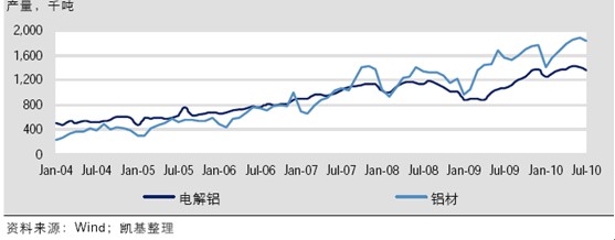 電解鋁下游主要消費(fèi)行業(yè)房地產(chǎn)和汽車增速下降,國內(nèi)鋁價(jià)表現(xiàn)仍比較疲弱,國內(nèi)氧化鋁價(jià)格出現(xiàn)上調(diào),原料成本上升將侵蝕電解鋁公司利潤,電解鋁行業(yè)的投資機(jī)會(huì)還需等待基本面出現(xiàn)轉(zhuǎn)好信號(hào)。 2010年1-7月國內(nèi)電解鋁累計(jì)產(chǎn)量954.6萬噸,同比增長41.9%,LME電解鋁價(jià)格目前處于回落調(diào)整中,而庫存還維持高位。