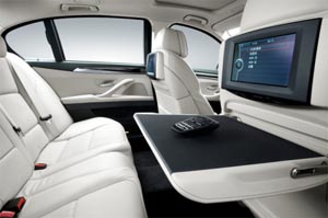 后排都標(biāo)準(zhǔn)配備了音頻系統(tǒng)的控制單元,包括集成在中央扶手中的一個(gè)控制器。可折疊并帶照明的化妝鏡以及前后排的兩個(gè)杯座同樣是標(biāo)準(zhǔn)配置。后排獨(dú)特的閱讀燈和在乘客向下移動(dòng)中央扶手時(shí)可打開(kāi)的冷藏箱,作為選裝配置提供。為BMW
