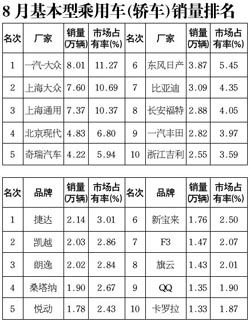 8月,銷量排名前十位的轎車品牌共銷售17.21萬(wàn)輛,占轎車銷售總量的24.16%。與上月比較, 前十位轎車品牌銷量八增二降,新寶來(lái)增長(zhǎng)最快,為22.422%;悅動(dòng)與凱越分別增長(zhǎng)16.34%、13.41%;F3和卡羅拉分別微降0.68%、2.92%。