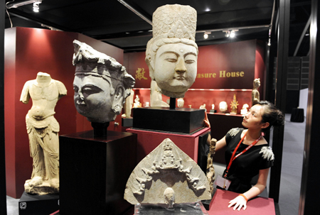 10月3至6日,亞洲最頂尖的古玩及藝術(shù)品博覽會——香港國際古玩及藝術(shù)品博覽(“FINEARTASIA2010”)在香港會展中心舉辦,呈獻(xiàn)約5000件跨越古今與東西方之藝術(shù)珍品,全場總值高達(dá)5億港元。圖為香港乾坤堂收藏的唐朝大理石雕塑《菩薩頭像》(上),價值達(dá)380萬港元。
