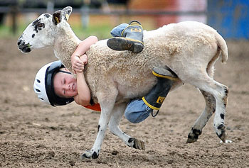 不過,大多數(shù)參賽者只堅(jiān)持1秒就從羊背上摔下來。上屆總冠軍洛根·萊梅爾現(xiàn)年8歲,雖然他超齡不能參賽,但他樂意分享奪冠訣竅:“重心前移,直到掉下來都緊抓不放!4歲的賈克森·富爾頓已晉級今年州決賽,他的經(jīng)驗(yàn)是抓緊羊毛,雙腿夾緊羊身。