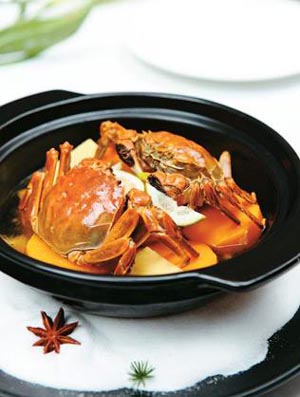 又稱凍蟹。很有聲勢的一大盤,碎冰鋪底,以中國式寫意處理裝盤。大閘蟹以黃酒醉上6-7天,待入味成熟,取出,放置大盆冰碎上活吃(很殘忍但近年來流行得一塌糊涂)。配花雕酒,邊吃邊養(yǎng)胃。裝盤講究,底盤裝飾海洋元素,珊瑚枝和小松枝、海石,很入畫面。