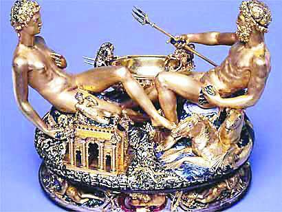 貝紐維多·切利尼(1500-1571):意大利十六世紀后半期雕塑家、樣式主義雕塑的代表人物。他受雇傭于羅馬的教皇和佛羅倫薩的執(zhí)政者美第奇家族,也被當時的法國國王所器重。他為法國王室和意大利統(tǒng)治者制作了大量金銀工業(yè)品和雕塑作品,手法富于裝飾性,藝術(shù)技巧出色。鹽碟雖然上了5000萬歐元的保險,但實為無價之寶。它的被盜所造成的損失遠遠超過了2002年全年奧地利所有失竊藝術(shù)品的總價值,被認為是二戰(zhàn)后奧地利最大的博物館失竊案。