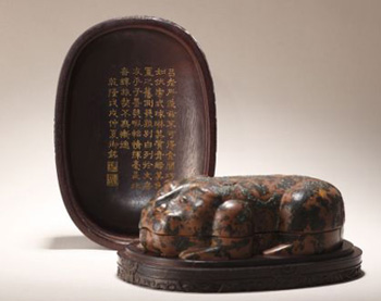 今年6月,在北京保利5周年春拍古董珍玩專場上,清乾隆“乾隆御用”御題詩澄泥伏虎硯及紫檀蓋盒以1400萬元成交,打破硯臺拍賣世界紀(jì)錄。今年5月,在中國嘉德2010春拍“翦淞閣——文房清供”專場上,清康熙御制松花石龍馬硯以425.6萬元高價成交,同樣引人注目。