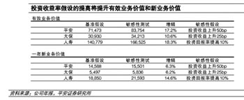 國信證券發(fā)布的報告也表示,壽險假設貼現(xiàn)率10%—11%、長期投資回報率4.7%—5.0%、21—24倍新業(yè)務乘數(shù),產(chǎn)險、銀行、證券按2倍PB,信托、集團及其他按1倍PB計算,人壽、平安、太保2011年估值分別為35.5元/股、102.1元/股、34.4元/股,分別較目前股價有31.3%、57.1%、27.1%上漲空間。