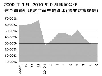 普益財富數(shù)據(jù)顯示,8月份銀信合作產(chǎn)品發(fā)行298款,較7月份下降26.42%,信貸類理財產(chǎn)品僅發(fā)行21款,在銀信合作產(chǎn)品中占比不足一成,其中,包括信貸資產(chǎn)投資類產(chǎn)品13款,信托貸款類產(chǎn)品8款;9月份,銀信合作產(chǎn)品發(fā)行307款,信貸類產(chǎn)品同樣發(fā)行21款,而純信托貸款類產(chǎn)品則絕跡于理財產(chǎn)品行列。