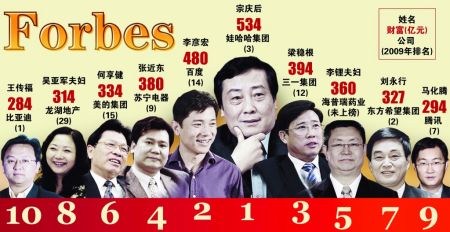 新榜單中的400人,提供了許多關(guān)于中國持續(xù)的經(jīng)濟繁榮和過去一年中財富膨脹的新觀點。在服務(wù)消費者的行業(yè)中的企業(yè)家繼續(xù)領(lǐng)先。榜單首位的宗慶后是娃哈哈飲料生產(chǎn)商。自去年宗慶后解決了娃哈哈和達(dá)能的糾紛,娃哈哈的天空變得蔚藍(lán);ヂ(lián)網(wǎng)的興起,本土企業(yè)對市場的掌控已經(jīng)超過了外國競爭對手,今年榜單第二名——百度搜索引擎的創(chuàng)始人之一李彥宏就是最好的體現(xiàn)。